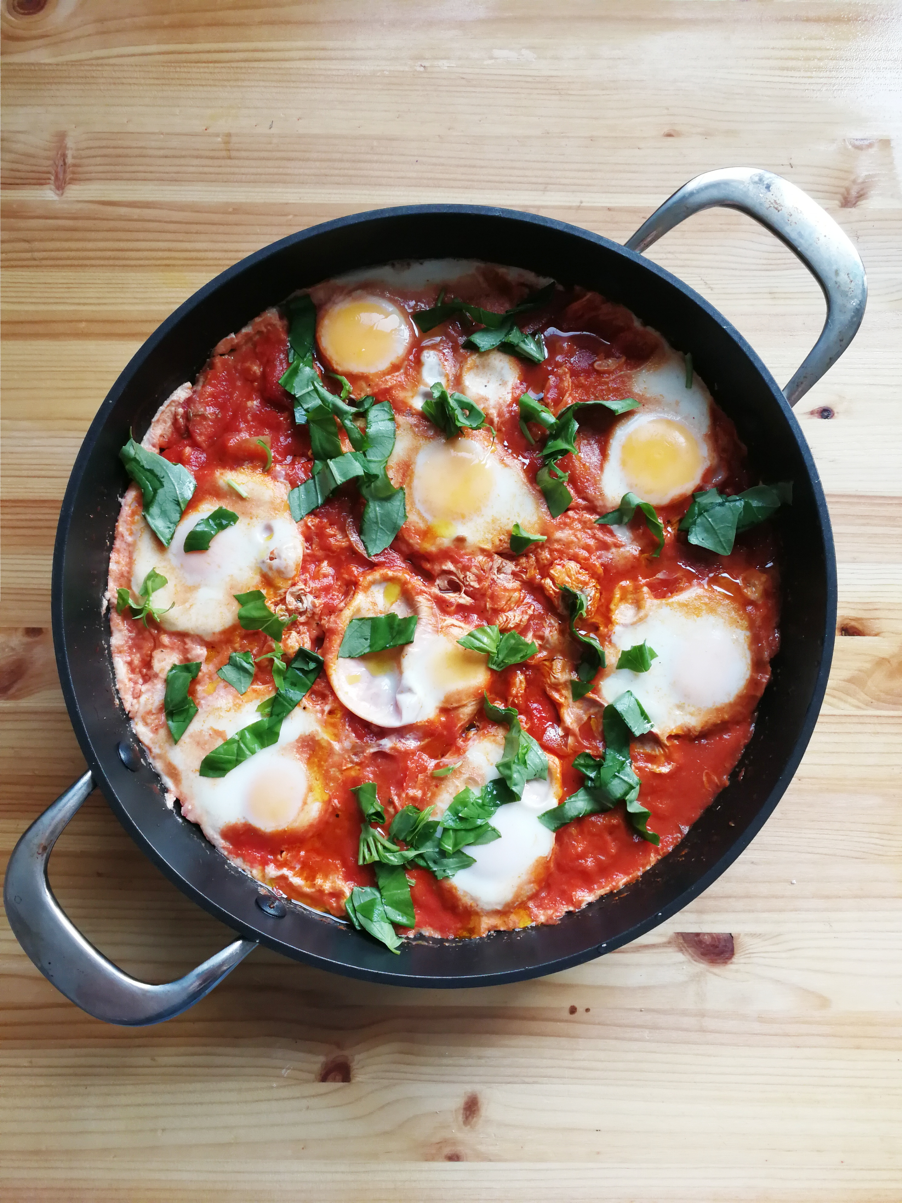 Подгответе си голям и дълбок тиган, ако има капак още по-добре. Загрейте зехтина. Нарежете чесъна на филийка, а лука на полумесеци. Сложете чесъна в загрятата мазнина и една шепа от лука. Запържете ги до златисто, за да пуснат аромата си. Извадете ги настрана, за да не прегорят. Изсипете останалата част от лука, намалете котлона и го гответе докато стане прозрачен. Нарежете чушките на кубчета и ги прибавете към лука. Гответе докато омекнат. Намачкайте доматите или ги нарежете и изсипете при останалите зеленчуци. Разбъркайте добре, прибавете всички подправки и оставете да поври около 5 минути. Чукнете яйцата, върнете запърженият чесън и лук и сложете капак. Оставете за още 5 минути, докато яйцата се забулят. Поръсете с нарязаният босилек преди сервиране